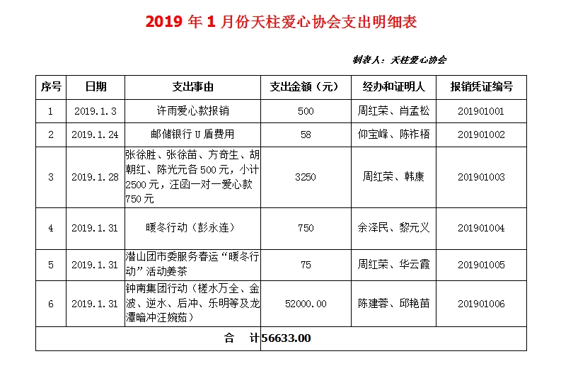2019年1月份天柱爱心协会支出明细表
