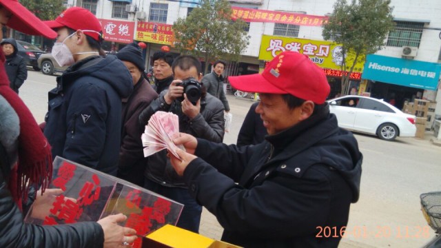 “物华天宝人杰地灵”、“春回大地福满人间”一张张墨迹未干、工整洒脱的春联从书法家的笔下流出。新春将至,为给贫困儿童孤寡老人送去温暖,进一步弘扬尊老爱幼的中华传统文化,2016年1月20日天柱爱心协会余井中心邀请安庆市书画家协会成员陈寿月、省美协会员韦先平、孙爱琴等10余名冒着寒风在潜山县余井镇广场挥毫泼墨,义写春联。用义卖字画的善款去帮助贫困儿童孤寡老人。一幅幅红红的春联或刚劲有力或俊逸潇洒有隶书、行体、草体。现场绘画了牡丹图、翠竹图等,一幅幅书画形象逼真。活动现场火爆引来不少观众纷纷前来购买。整个活动历时4个小时.共筹集善款13000多元。
