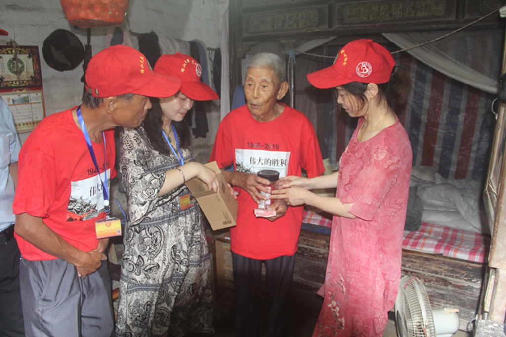 志愿者先后来到源潭双峰居委会、余井镇马道村、雄峰塑业集团和油坝乡张祠村,看望慰问了抗战老兵徐东旭、江洪涛、刘观明和夏德兴,为他们送上了现金红包和由爱心企业卫华商贸提供的金银花露和甄养有机牛奶,志愿者们为老人们现场换上了老兵组织统一提供的纪念T恤,并与老兵们聊天、拉家常,了解老兵的饮食、生活和身体状况。