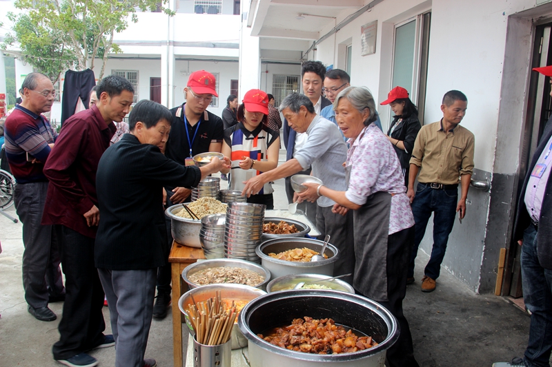 到了开饭时间,志愿者们到每个房间召集老人吃饭,并将行动不便的老人或搀扶、或团抱到桌前,为老人盛上米饭、配好蔬菜、饺子和面条,将一盆盆“爱心餐“端送到老人面前,就连参加活动的小朋友也在帮忙摆放碗筷,忙得不亦乐乎。老人们吃着丰盛可口的饭菜,脸上洋溢着幸福的笑容。等老人们吃完后,志愿者们才在厨房和广场上简单地吃上中餐。林加庆是本次活动的联系人,他说,“一顿饭十个菜,对于一般家宴来说不算什么,但对于这些孤寡老人来说,可能会是一段美好的回忆。”