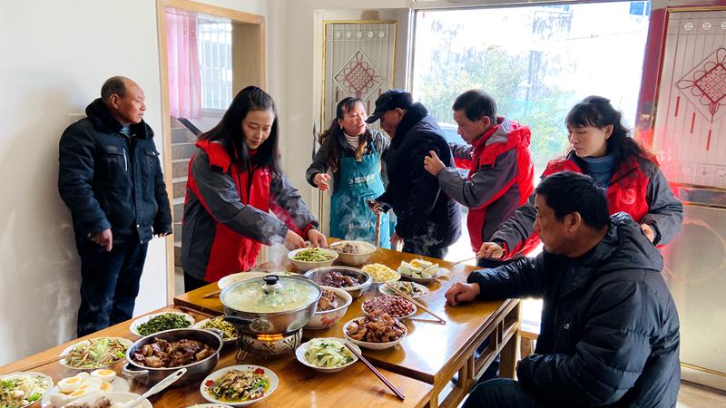 饭菜摆好了,老人却不愿意上桌吃饭。在志愿者和老人子女的一再要求和劝说下,才坐到桌前。志愿者为老人夹菜、盛饭,以茶代酒,祝老人健康长寿。