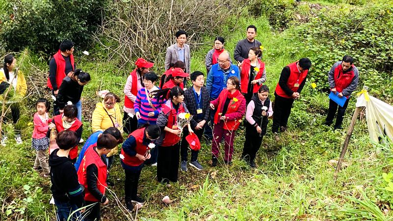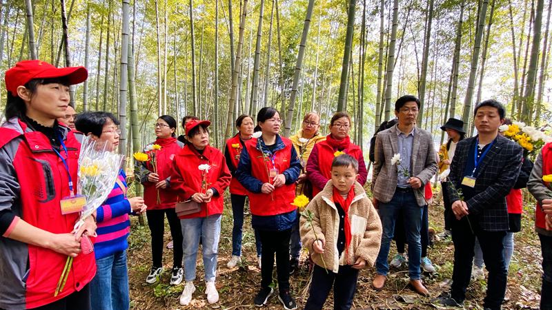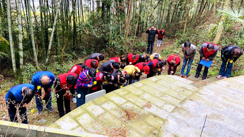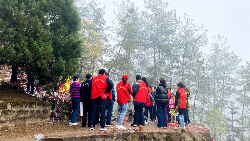 志愿者们随后来到花山尖曹营长墓地,祭拜长眠在这里的300多位抗战英烈。1938年5月下旬,国民革命军陆军138师412团某营营长曹潘润奉命率部驻守花山尖,与日军展开激战,最终因寡不敌众,全营372位抗战军人的生命戛然而止。为缅怀为国捐躯的曹潘润营长及士兵,当地村民自发捐款4万余元,修建公路、墓地和忠烈祠。