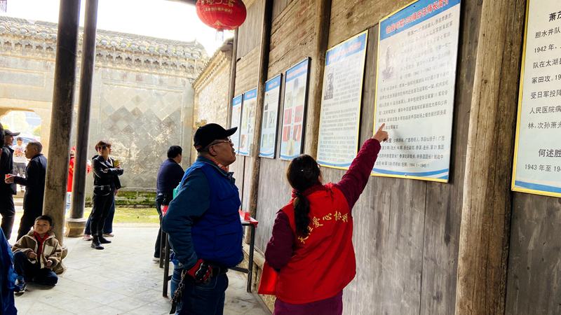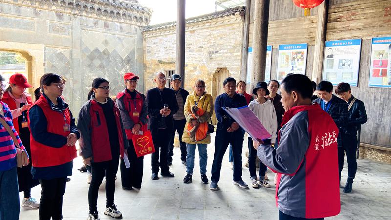 在138师部旧址,志愿者们参观了旧址内阵列的抗战文物,并聆听了管理小组志愿者有关41军138师及其抗战历史介绍。138师部旧址位于黄铺镇云峰村李大屋,市级文物保护单位。这一清康熙年间的古建筑,抗战时期曾作为138师指挥部,为中国人民抗击日寇发挥过重要作用。近年来,在当地热心村民及各级部门支持下,该文物得到有效保护和利用。他们收集整理了大量资料,将其建为牌楼抗战纪念馆并对外开放,爱国主义教育基地。