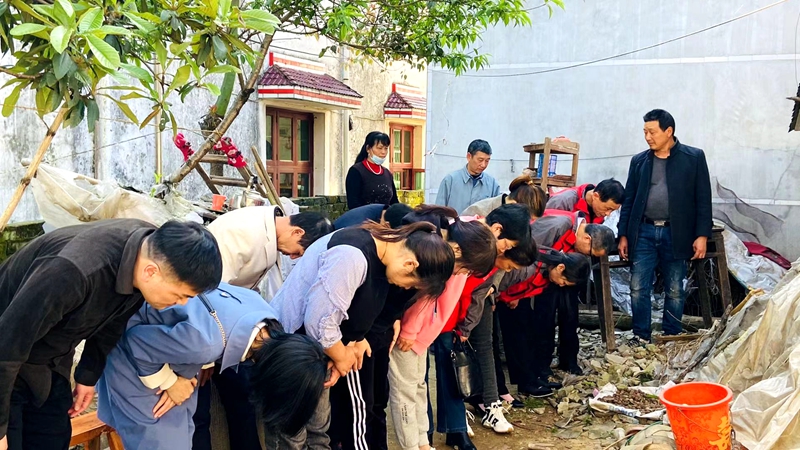 “老兵一路走好”,在老人的遗体前,志愿者们一一磕头祭拜,并来到屋外的场地上,集体向老人三鞠躬,与老人做最后的告别。
