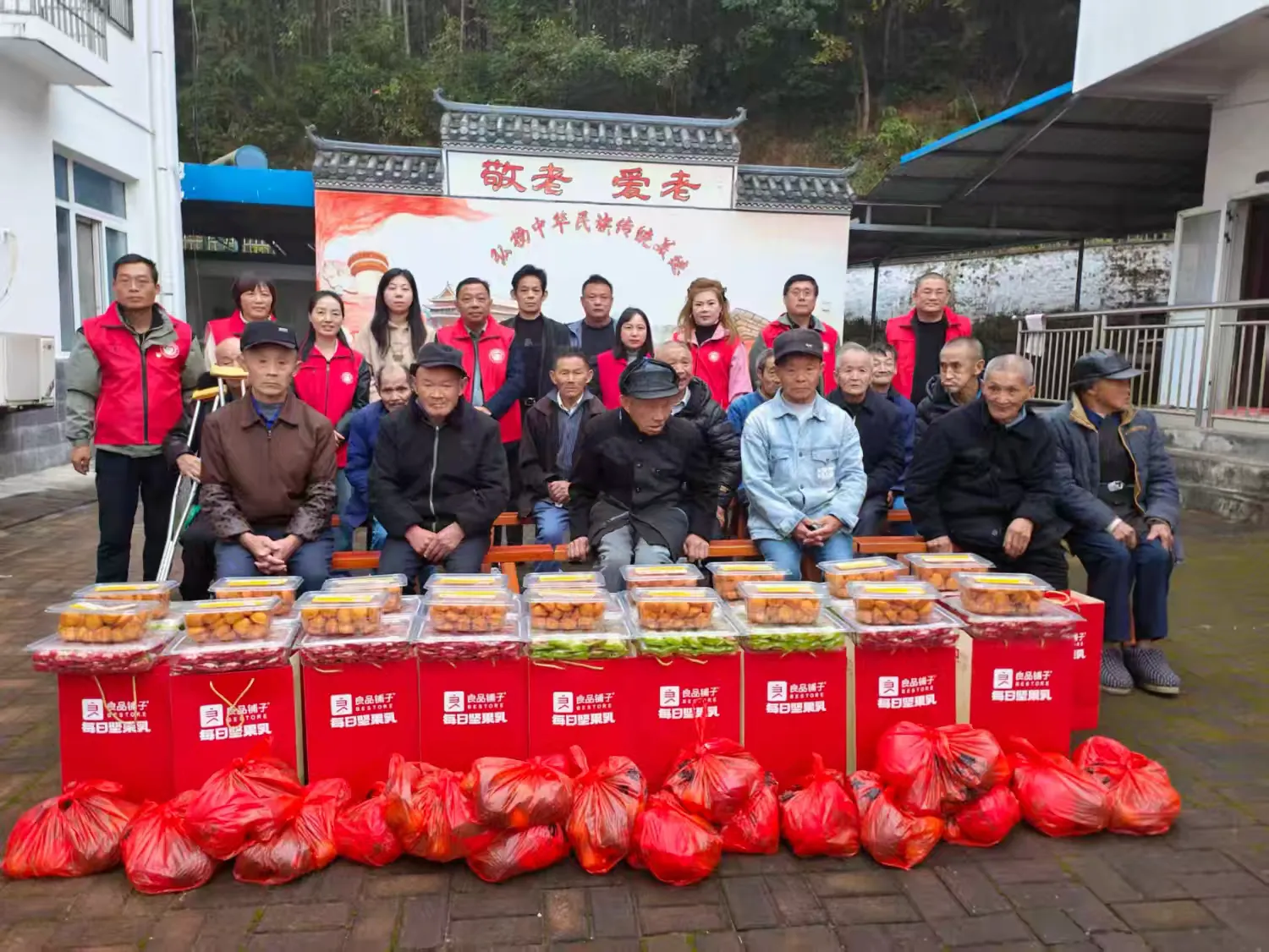 活动尾声,志愿者为每位老人送上装着糕点、水果、生活用品与营养品的“爱心大礼包”。大家蹲在老人身边拉家常,“天冷了要记得加衣服”,朴实话语与温暖举动让老人们笑容灿烂。用餐时,坚持“老人优先”,待所有老人入座、饭菜上志愿者和老人分享美食,欢声笑语回荡庭院。