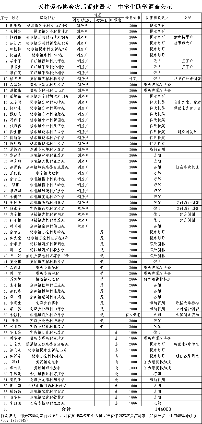 天柱爱心协会灾后重建暨大、中学生助学调查公示