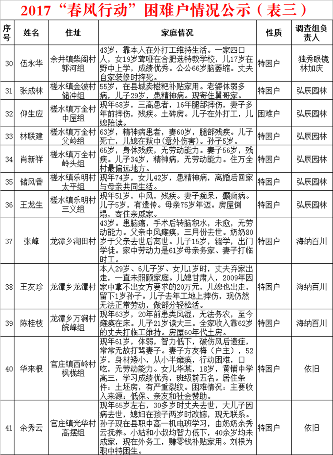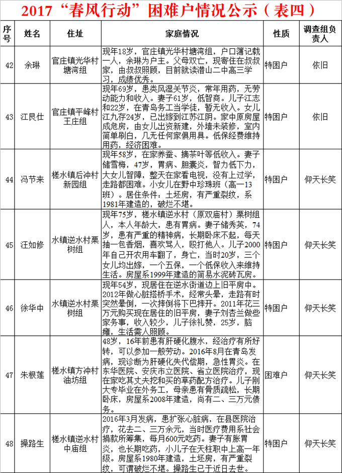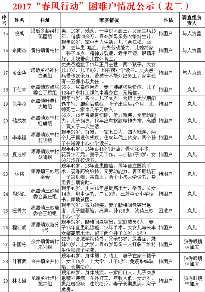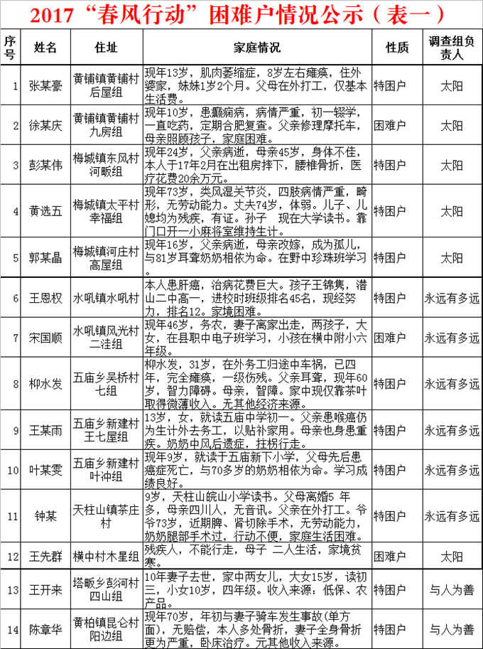 根据“春风行动”工作方案,4月13日至16日,协会共组织会员80余人次,分九个小组,对前期收到的53户困难家庭进行上门走访调查,经协会理事会议对调查材料逐户审核,决定本次“春风行动”重点帮扶48户困难户(见附表)。协会理事会、协会党支部将在近期陆续开展慰问工作,敬请广大会员和党员朋友关注协会QQ群、微信群等相关通知,积极参加慰问工作。