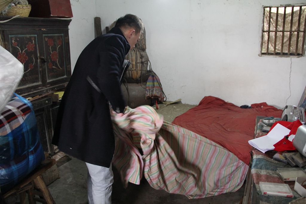 老人原来床上的被子很消薄,并且很脏,会员在给老人旧被子拆下来