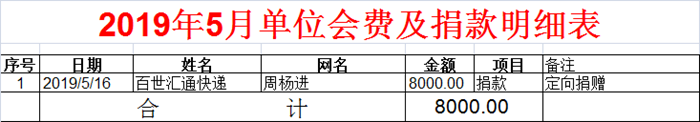 2019年5月份单位会费及捐款公开